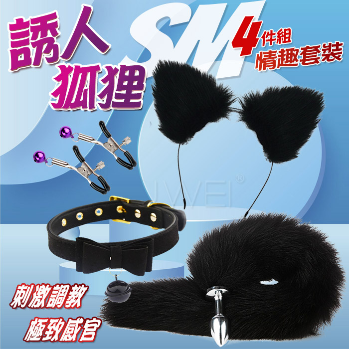 誘人狐狸.裝扮遊戲4件套組﹝狐狸尾巴+毛絨髮箍+蝴蝶頸圈+鈴鐺乳夾﹞黑色