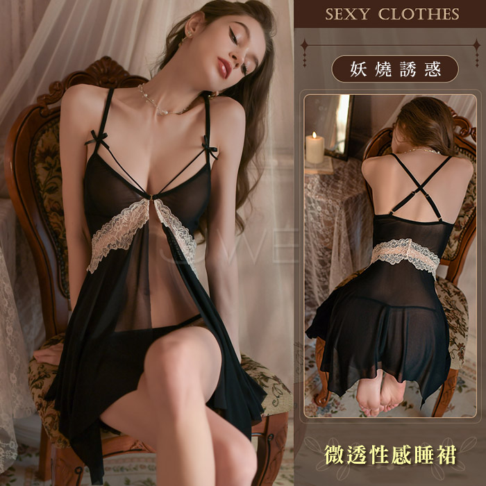 輕紗漫舞.性感輕紗蕾絲誘惑透視露背睡裙-黑色