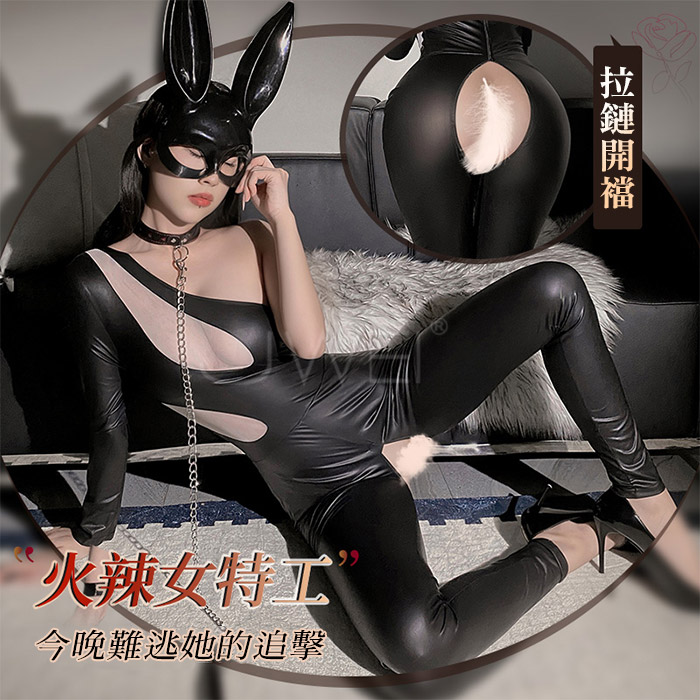 火辣特工.誘惑仿皮個性鏤空開襠連身衣
