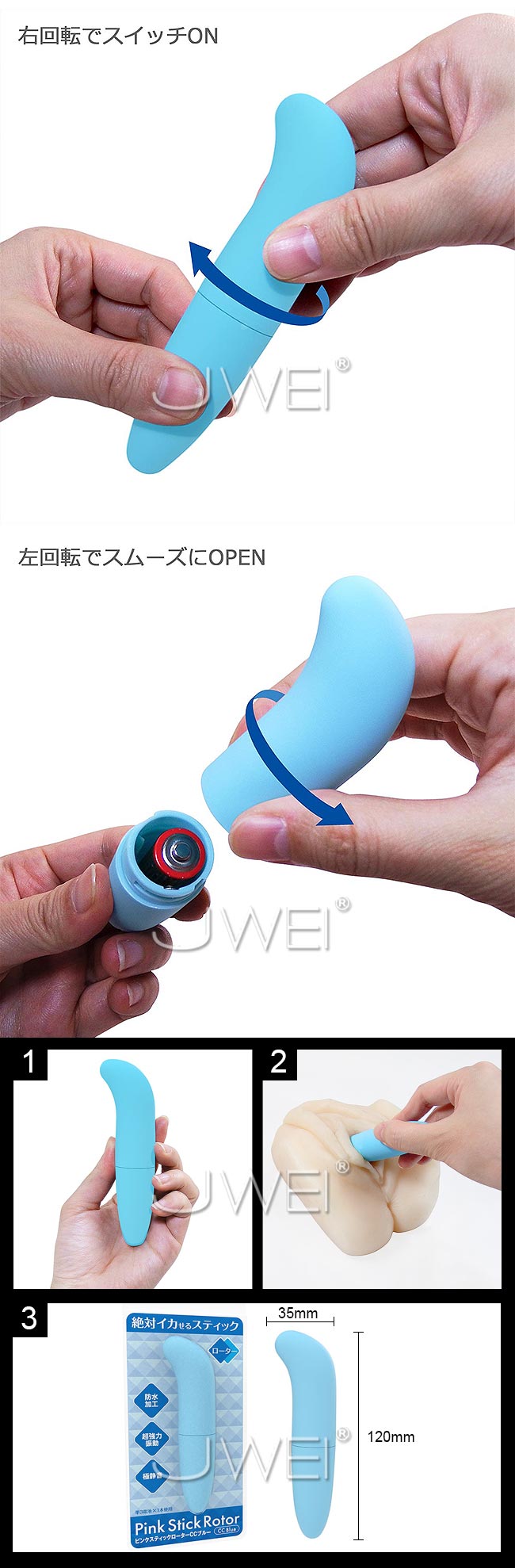 スマートなスタイルと可愛らしいカラーリングでどこへでも持ち歩きたくなっちゃう、スティックタイプのローター。 スッキリとしてシンプルなデザインで、表面が滑らかなので、スムーズに挿入することができ、使用する電池は1本ながら、驚くほどパワフルな振動が楽しめます。 さらに、先端部分がクイッと曲がっているので、中に挿れた時に先端がGスポットにピタッと当たり、ピンポイントで刺激を伝えることができます。 コンパクトで持ち運びにも便利なので、旅行等のお供としても最適です。