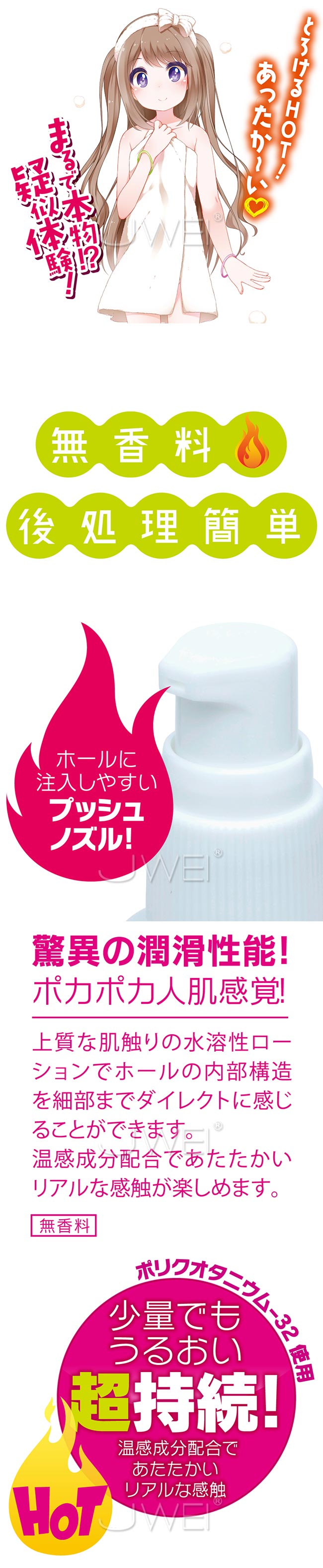肌になじみやすい上質な質感の水溶性ローションで、ポカポカと人肌温度のHOTタイプの潤滑液です。 オナホール内部に注入しやすいプッシュノズルを採用しているボトルだから、液ダレをしてしまって使用する前の手間が増え、気分が萎えてしまう心配もありません。 ホールの内部構造を細部までダイレクトに感じられる水溶性ローションだから、よりリアルな快感を味わえちゃいます。 お手持ちのオナホールが劇的に変化する。まるで本物!?のような疑似体験ホールに変身させて、プレミアムな快感を思いっきり楽しんじゃいましょう