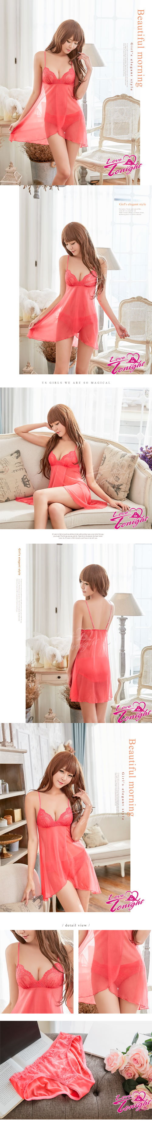 細緻的桃紅色緹花蕾絲點綴性感深V,