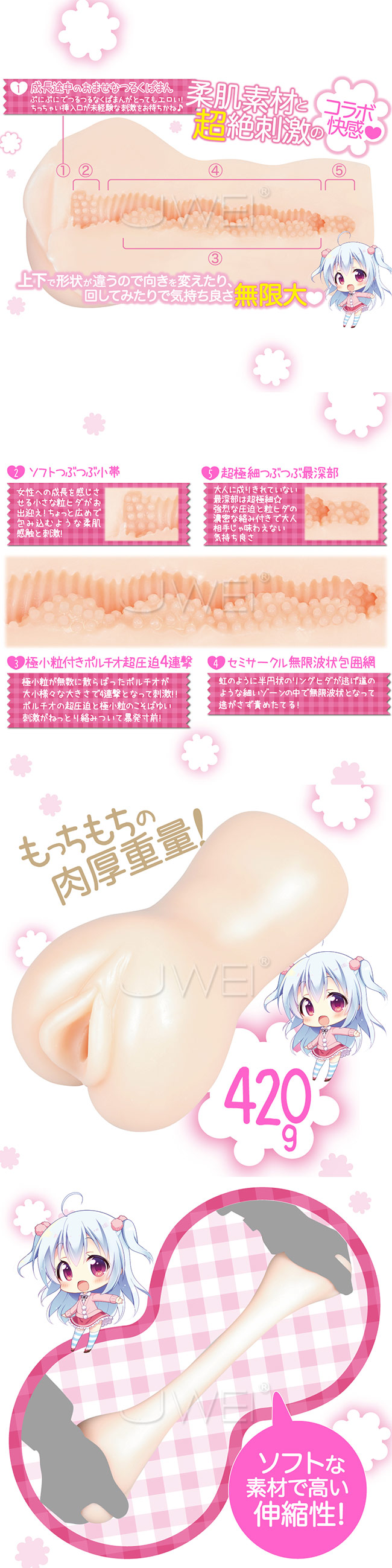 【日本製】成長途中のちょっぴりおませでつるつるのアソコを再現した、初々しくてとってもエッチなオナホール。 もちもちとして伸縮性抜群の素材でできたボディは優しく包み込むような柔肌感触で、可愛らしくもちょっと卑猥な入り口から挿入すると、小さなつぶつぶ達のソフトな刺激が出迎えてくれます。 さらに、その先は上側が奥まで続く半円状のリングヒダ、下側は4つの隆起に極小粒が無数に散らばった構造になっていて、上から全体を逃さずゾリゾリと擦りながら、下からグイグイと圧迫しつつ、つぶつぶのこそばゆい刺激で責め立てます。 上下で形状が異なる構造なので、向きを変えたり、回してみたりすると、また違った気持ち良さがお楽しみ頂けます。