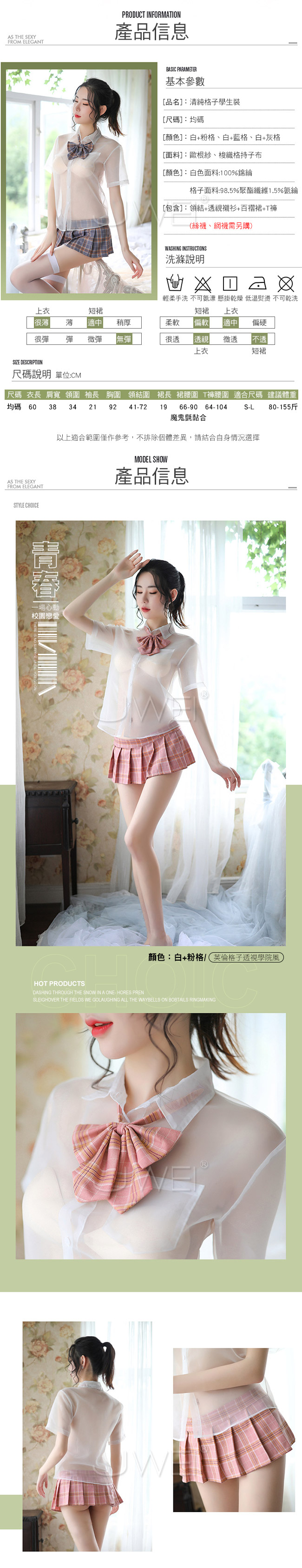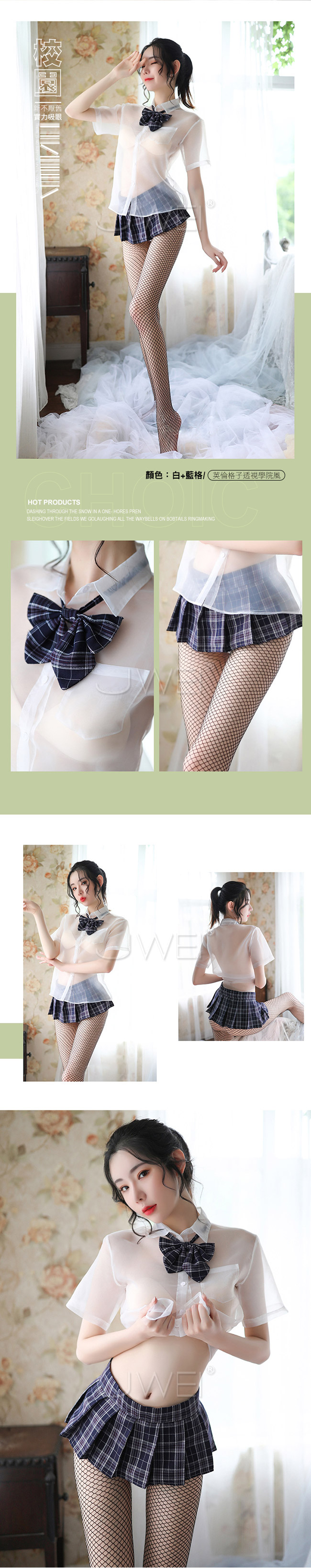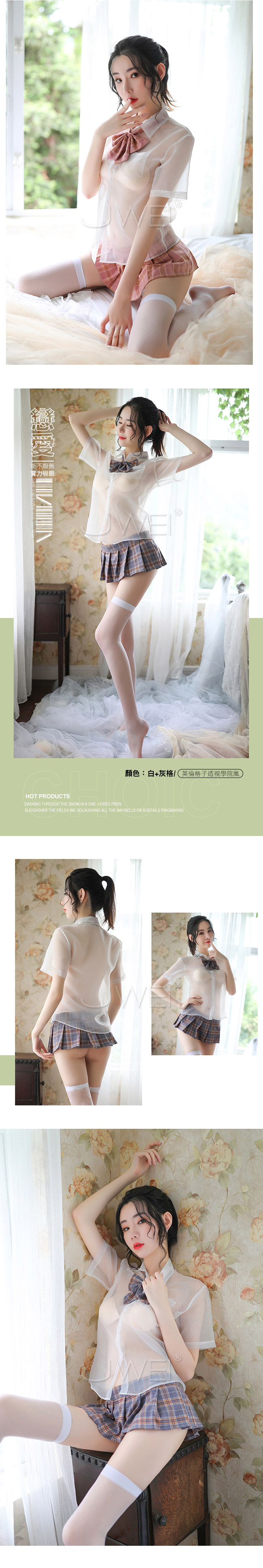 下身英倫格子百褶裙,胸前搭配可愛的蝴蝶結,
