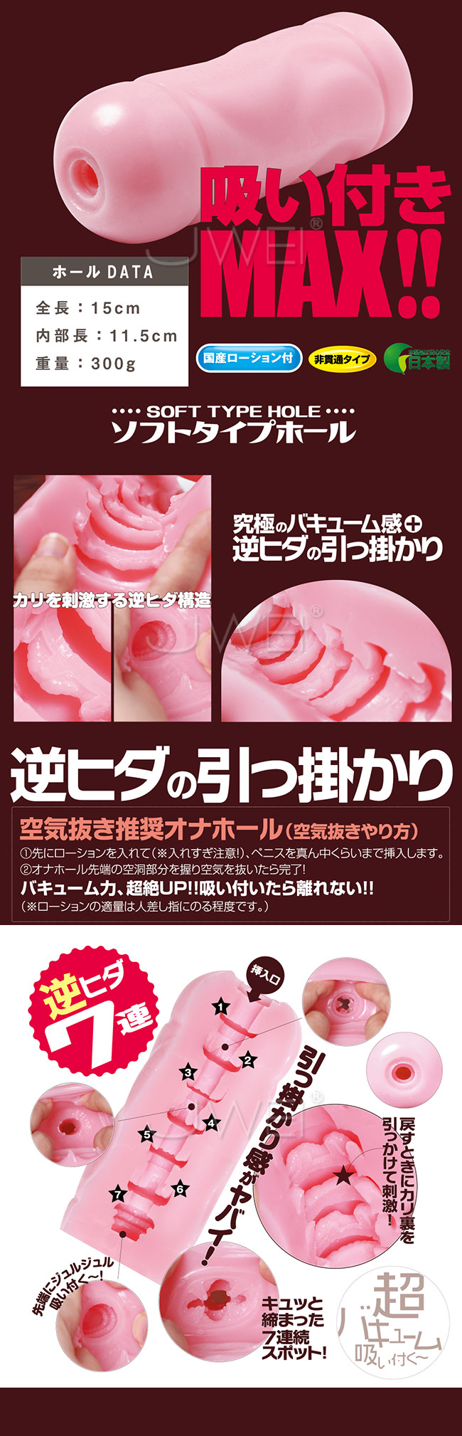 究極のバキューム感と、ゴリゴリ刺激の7連続の逆ヒダ、柔らか素材によるフィット感と吸い付きMAXのオナホールです。 ソフト素材で作られたオナホなのに、キュッと窄まった逆ヒダによる引っ掛かりがあるので、まったりと刺激の両方を。 エア抜きをして、密着度マックスのバキュームを堪能出来ちゃいます。 吸い付いたら離れない、ナナのアソコ。