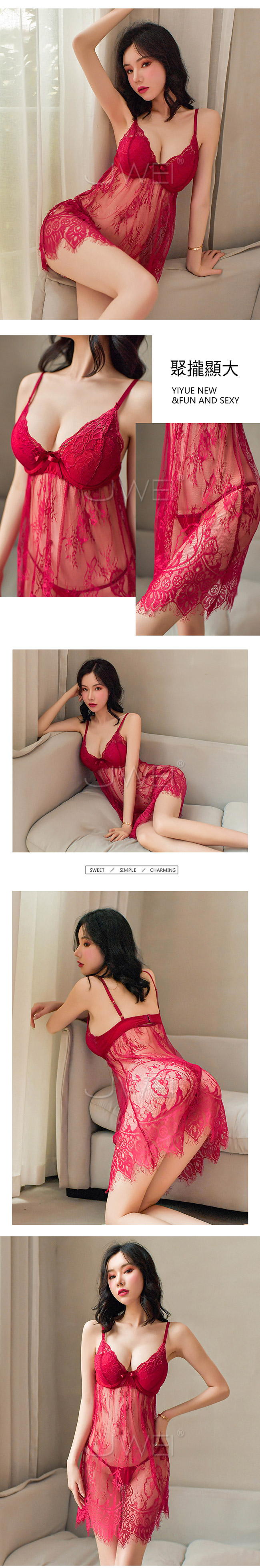 | 柔情似水.鋼托聚攏性感蕾絲吊帶睡裙(酒紅色)
