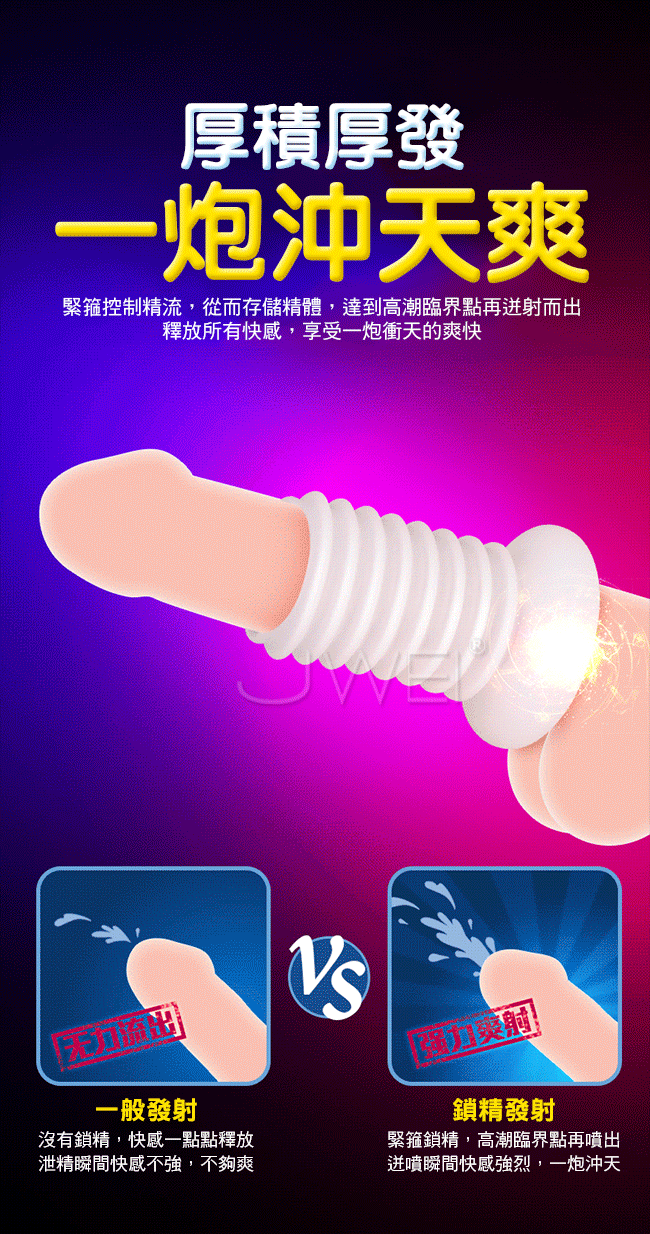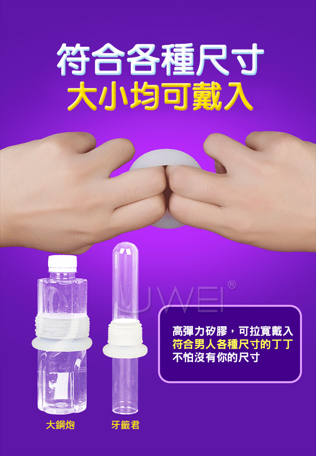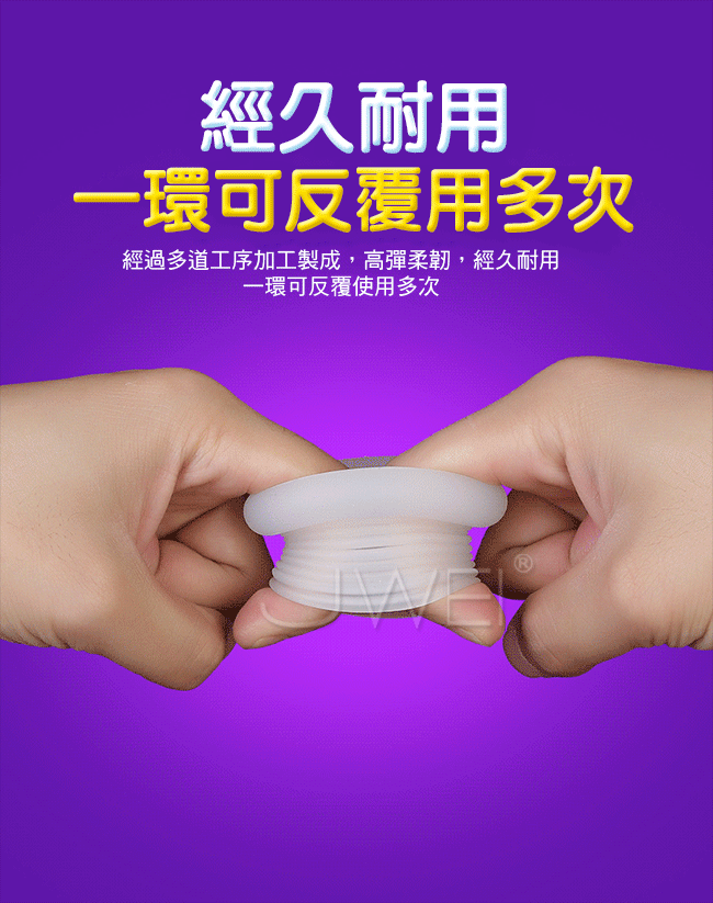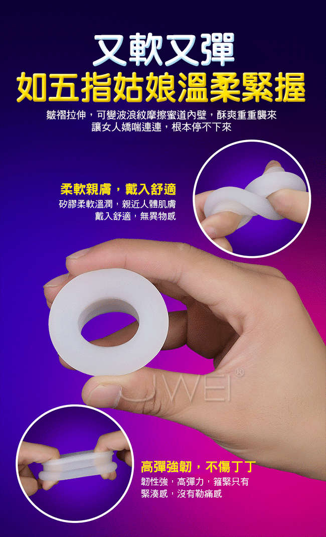大丈夫鎖精環採用風琴式皺褶設計能伸能縮,拉伸可變成8道浪紋刺激蜜道,層層快感疊加讓女人更快抵達高潮,收縮可緊箍丁丁根部,加強鎖精,讓男人更為久戰。此款鎖精環採用柔軟溫潤矽膠,親近人體肌膚戴入舒適,無異物感讓您安心使用。且彈力十足符合男人各種尺寸喔~