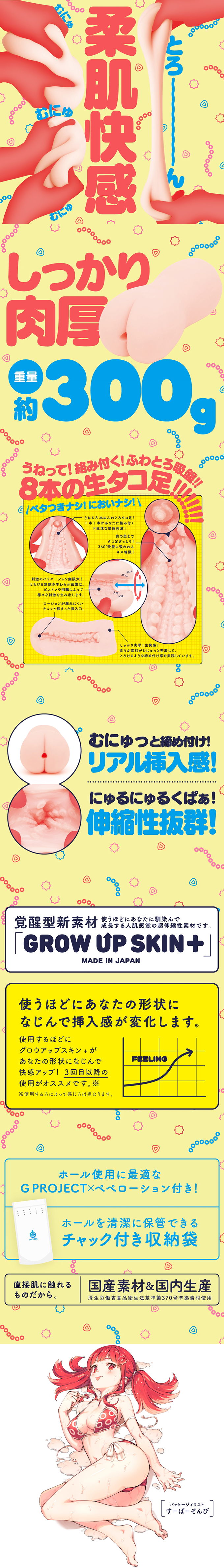 大受歡新迎的『終極皺褶處女OCTOPUS』軟版登場!8隻觸手搭配無數柔軟的吸盤。帶您體驗異世界魅惑的感覺。扎實肉厚重量約300g!波紋般纏結您的8條章魚腳給您帶來快感!數不盡的柔軟吸盤毫無疑問的會使您融化!可以伸縮或迴轉的方式來開發各種刺激的方法!覺醒型素材【GROW UP SKIN+】會隨著用家使用而變得更貼合用家,跟真人皮膚有一樣感覺的超伸縮性素材。使用可安心直接接觸皮膚的日本國產素材以及在日本國內生產MADE IN JAPAN。包裝盒插畫家:すーぱーぞんび