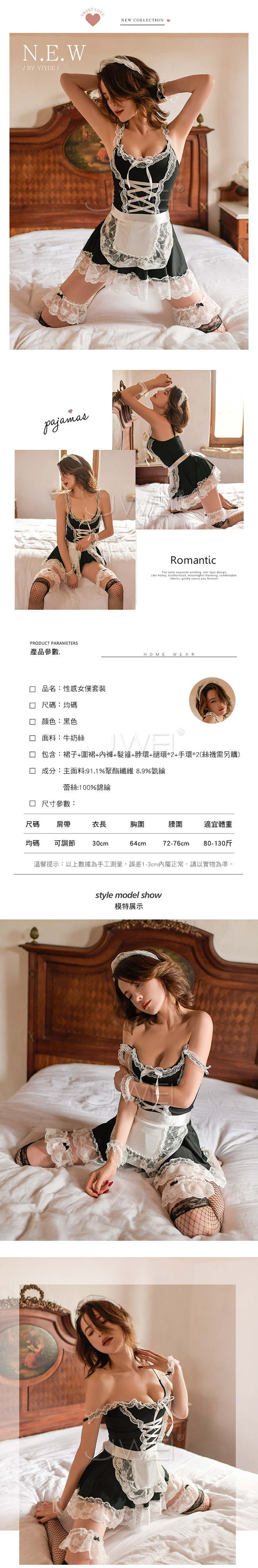 ■內容物:裙子x1、圍裙x1、內褲x1、髮箍x1、脖環x1、腿環x2、手環x2(絲襪需另購)