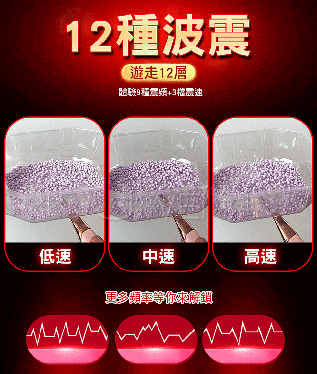 12種波震,體驗9種震頻+3檔震速,聚焦設計和強力震波, 準確、高頻深震擊、深層刺激,縱向波動, 由外到內、橫向波動,從點到面,更多頻率等你來解鎖~