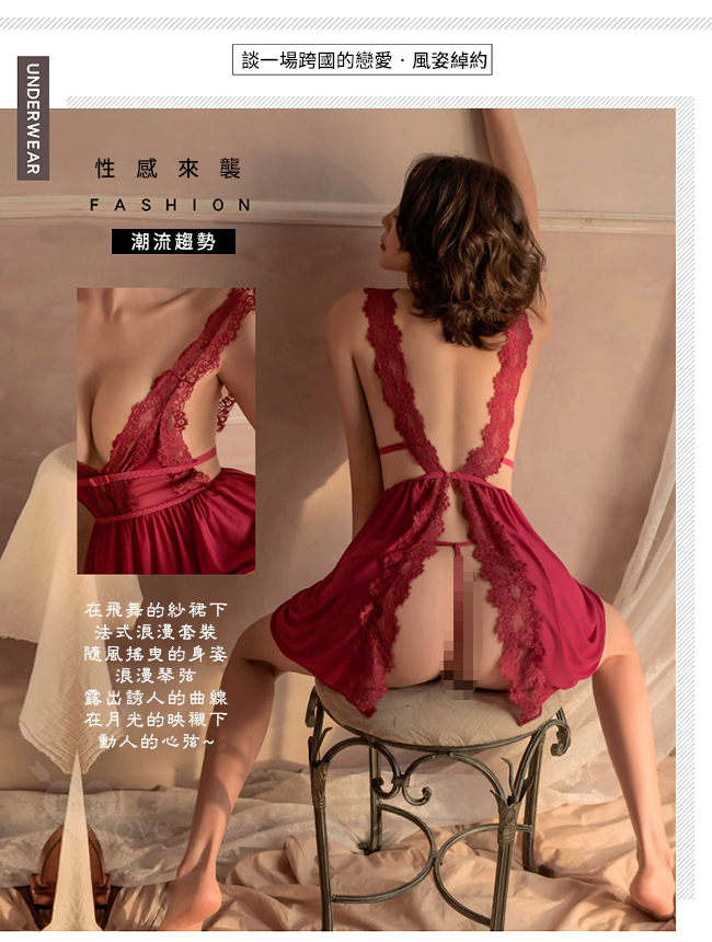 | 《 Enjoy Love 》情趣睡衣!寬版蕾絲雙彈力帶側鏤空後開襟連身裙兩件組﹝酒紅﹞