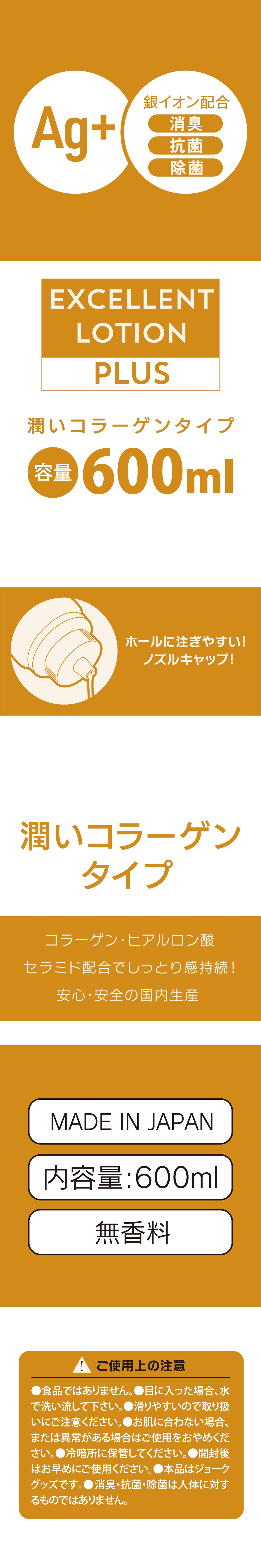 Ag+ Excellent Lotion全新升級。搭配銀離子可消臭抗菌除菌,能更安全衛生地使用 (※除臭、抗菌、殺菌部分對人體沒有作用)。保濕膠原蛋白款搭配膠原蛋白,透明質酸,神經酰胺,以持續保持潤滑的感覺。使用尖嘴瓶蓋,易於注入入口較窄的自慰套。超大容量600ml。安心安全的日本國內生產。