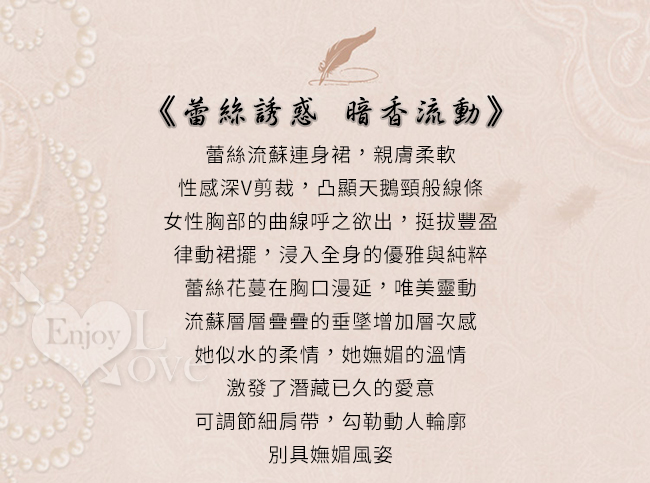 ※ 商品內容:流蘇連身裙+丁字褲。 ※ 商品材質:90%聚酯纖維+10%氨綸。 ※ 商品尺寸:FREE SIZE,適穿胸圍35吋(含)以下,適穿腰圍36吋(含)以下,丁字褲適穿腰圍27~40吋(中腰)。 ※ 長度單位換算 : 1吋=2.54cm。 ※ 注意事項:基於保障消費者個人衛生,此貼身衣物恕不接受退換貨。 (如為商品本身暇疵,接受七日內換貨,請勿試穿,謝謝您)