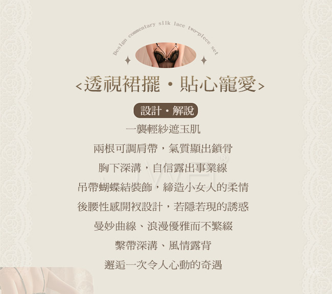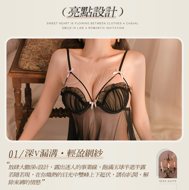 ◇◆誘惑奇遇.深V露溝輕盈網紗透視睡裙2件組(黑色)◆◇