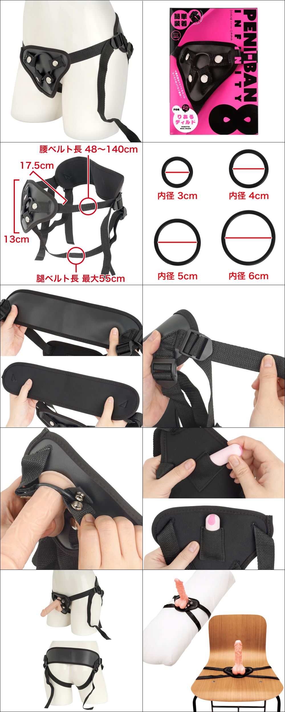 高潮方式、進攻方式、∞(無限大)!!可以享受男凸女凸男凹女凹各種組合的假陽具束帶!4個按扣牢牢固定假陽具。只需拉動腰帶即可使其貼合,易於穿戴!配有4種矽膠環,可按照所使用的假陽具的尺寸來配合使用!使用由聚氨酯材料和皮革尼龍製成的優質腰帶,並配有即使受到壓迫時也不易感到疼痛的護腰。假陽具束帶背面有一個迷你口袋,可以裝上跳蛋,爽度更高!在小兄弟起不來時給予支援!可綁在椅子或抱枕上,跟喜愛的人物進行妄想H、炫耀PLAY時大派用場!(因為不是相撲選手丁字型腰帶那樣的規格,所以可以綁上)也可以穿在胸前進行強迫直視的變態PLAY♪腰圍可以從43cm調整到130cm。※假陽具的吸盤不適合皮革尼龍。如果您想更牢固地固定假陽具,請使用輔助板。※本產品不包含假陽具和跳蛋。建議使用彈力仿真假陽具!※如果本產品上有髒污,請使用濕毛巾擦拭清理。審查編號:2301971