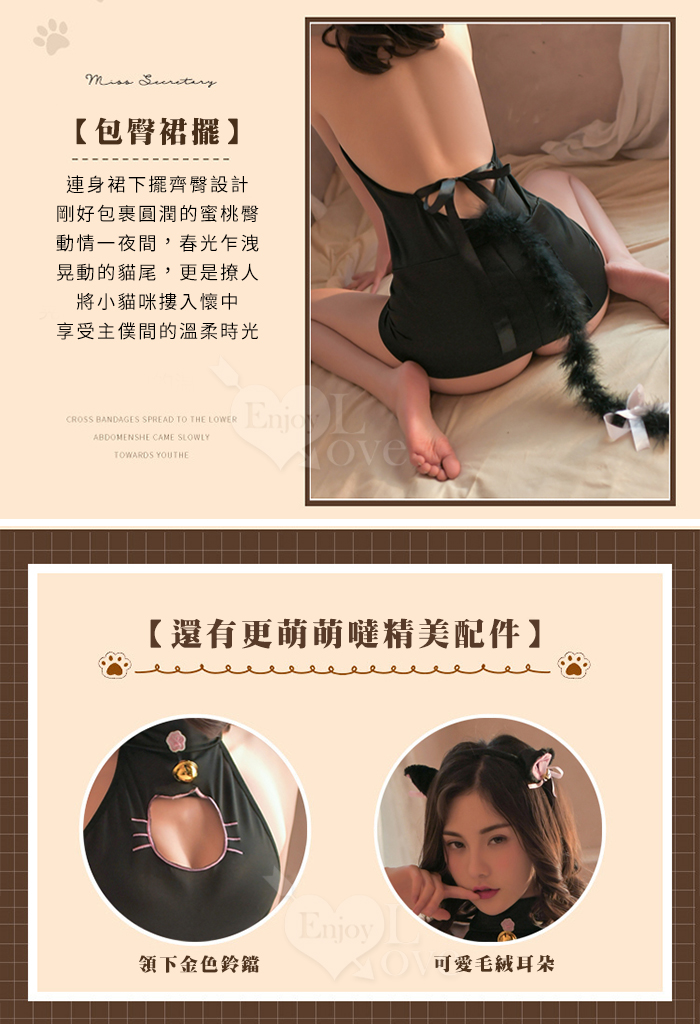 | 情趣睡衣!貓耳髮飾造型鏤空削肩裸背連身裙三件組﹝黑﹞