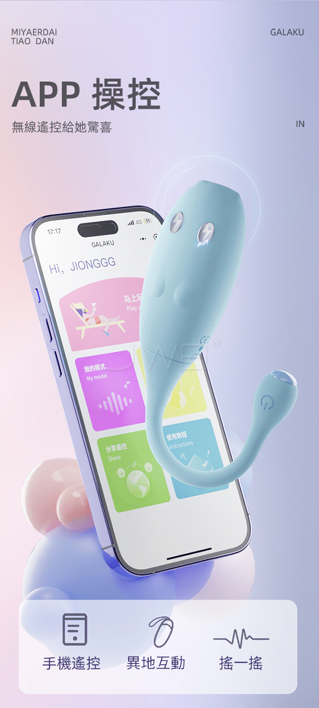 小搗蛋電擊跳蛋,更深層次的高潮;EMS-微電流刺激,體驗不一樣 的酥麻,穩定電壓輸出,無刺痛感,穿透皮膚直達敏感點,酥麻酸爽 用一次忘不了,越電越爽越會夾,微電流刺激私處震顫,被動收緊刺 激更加强烈;動感強震縱享急速高潮;APP操控異地互動,無線遙控 給她驚喜;Q彈矽膠觸感絲滑柔軟;多層隔音防聲穿透夾膜;生活防 水清潔無負擔。