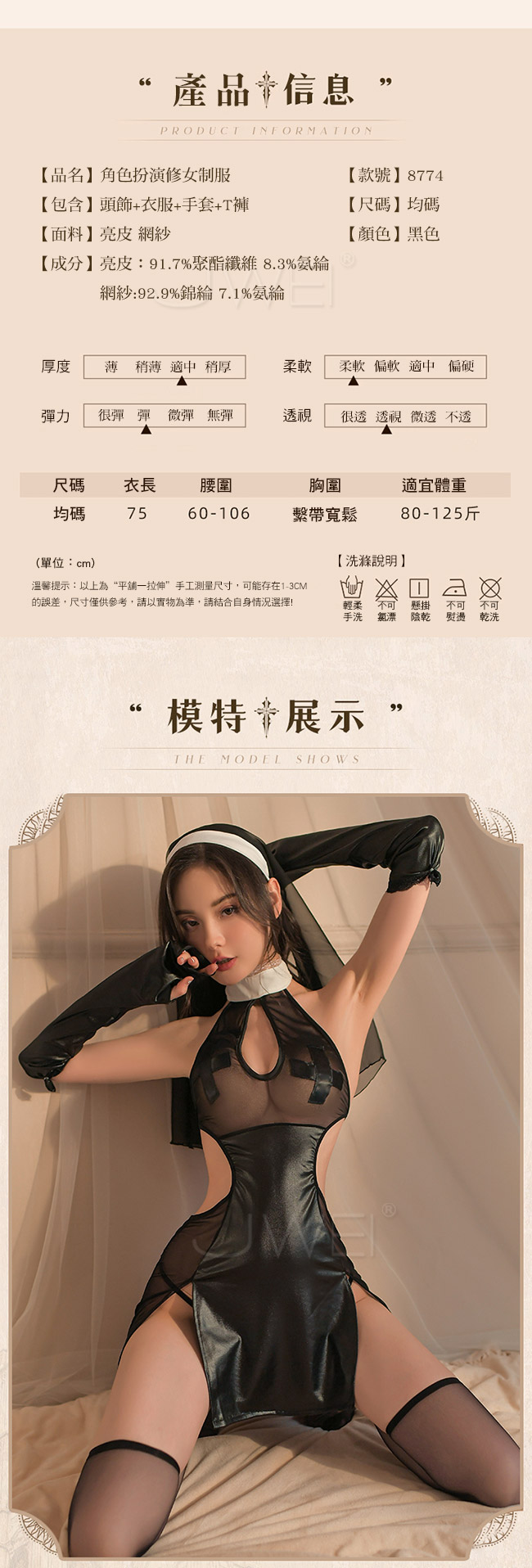 ►您現在的位置:首頁>魅魔修女.精美蕾絲掛脖立領兩側高開衩修女制服套裝4件組