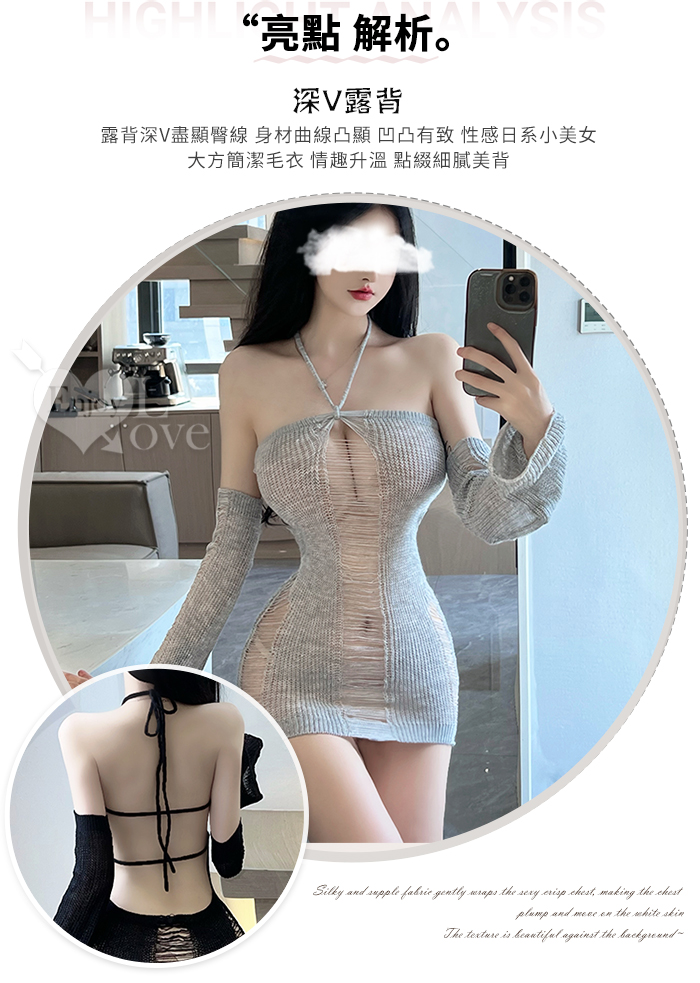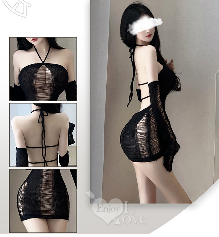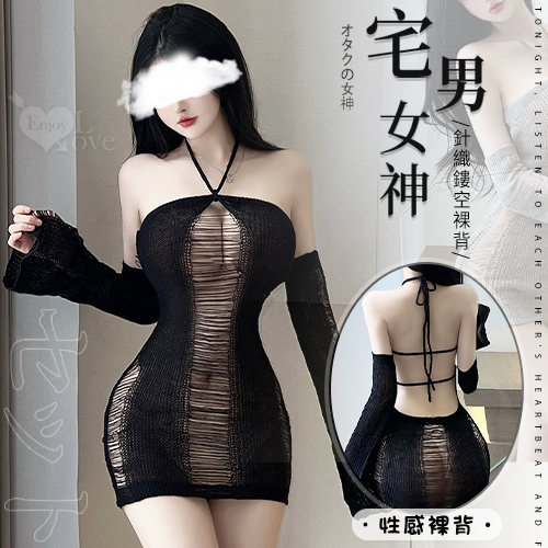 情趣夜店派對服!針織鏤空平口香肩裸背包臀裙喇叭袖兩件組﹝黑﹞