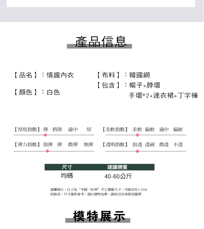 2.基於保障消費者個人衛生,情趣衣物類恕不接受退換貨,如為商品本身暇疵,接受三日內換貨,請勿試穿。