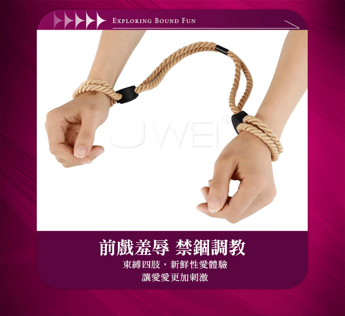 禁錮調教,棉繩手腳銬 沉浸在網綁中,被虐的享受,讓愛愛更加刺激 材質柔軟配適 柔軟親膚,戴上他替身體帶來愉悅的幸福感 ●材質:棉繩 ●重量:如圖示 ●尺寸:如圖示 ●注意: SM道具請以安全、清醒、非強迫為使用原則, 使用前請先徵得對方的同意