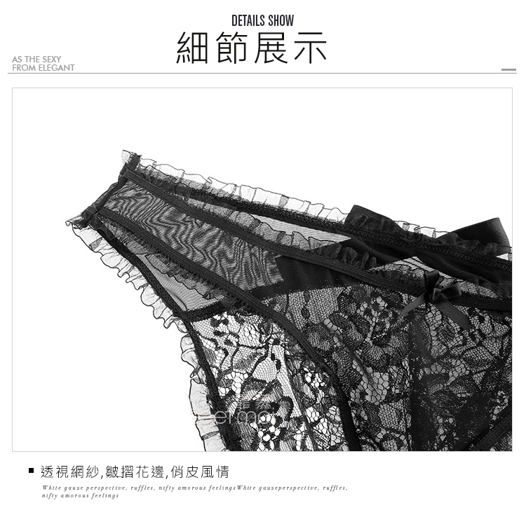 ※ 商品主材質:96.2%錦綸+3.8%氨綸、蕾絲花邊100%錦綸。 ※ 檔部材質:100%棉 。 ※ 商品尺碼:FREE SIZE (適合體重45~65kg) 。 ※ 商品內容:內褲乙件(不包含腿環) ※ 注意事項:基於保障消費者個人衛生,此貼身衣物恕不接受退換貨,謝謝您! (如為商品本身暇疵,接受七日內換貨,請勿試穿,謝謝您) ※ 網頁商品會因為您使用不同的品牌螢幕以及解析度不同,造成圖片顏色呈現會略有不同。 ※ 本商品圖片經授權使用,請勿任意盜圖,以免觸法!