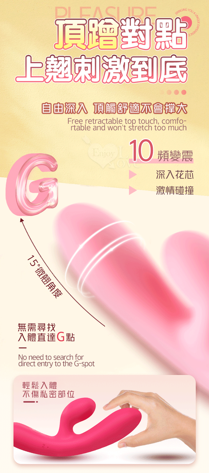►您現在的位置:首頁>PLEASURE 西婭 ‧ 雙強震動10頻撩撥入體內外刺激G點按摩棒﹝親膚矽膠/收腰設計/15微翹角度﹞洋紅